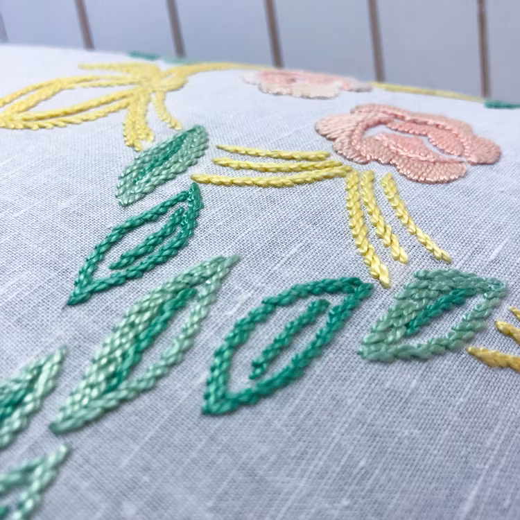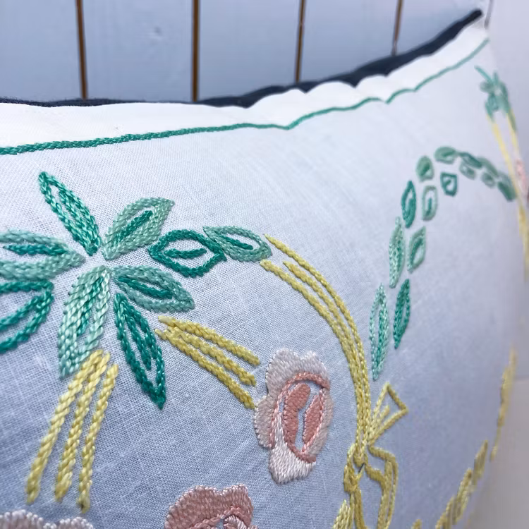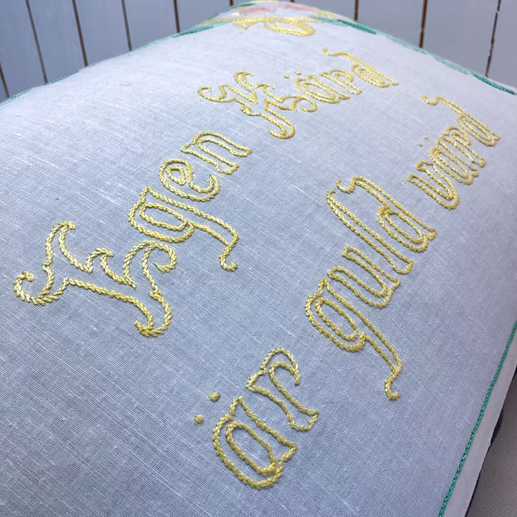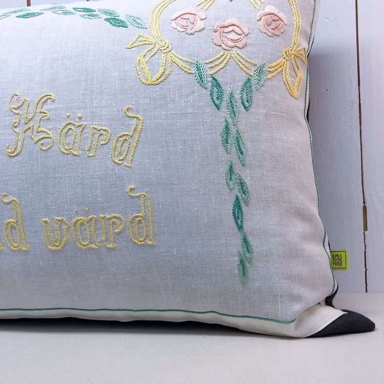Kudde med framsida dekorerad av en broderad bonad med texten ”Egen härd är guld värd”.