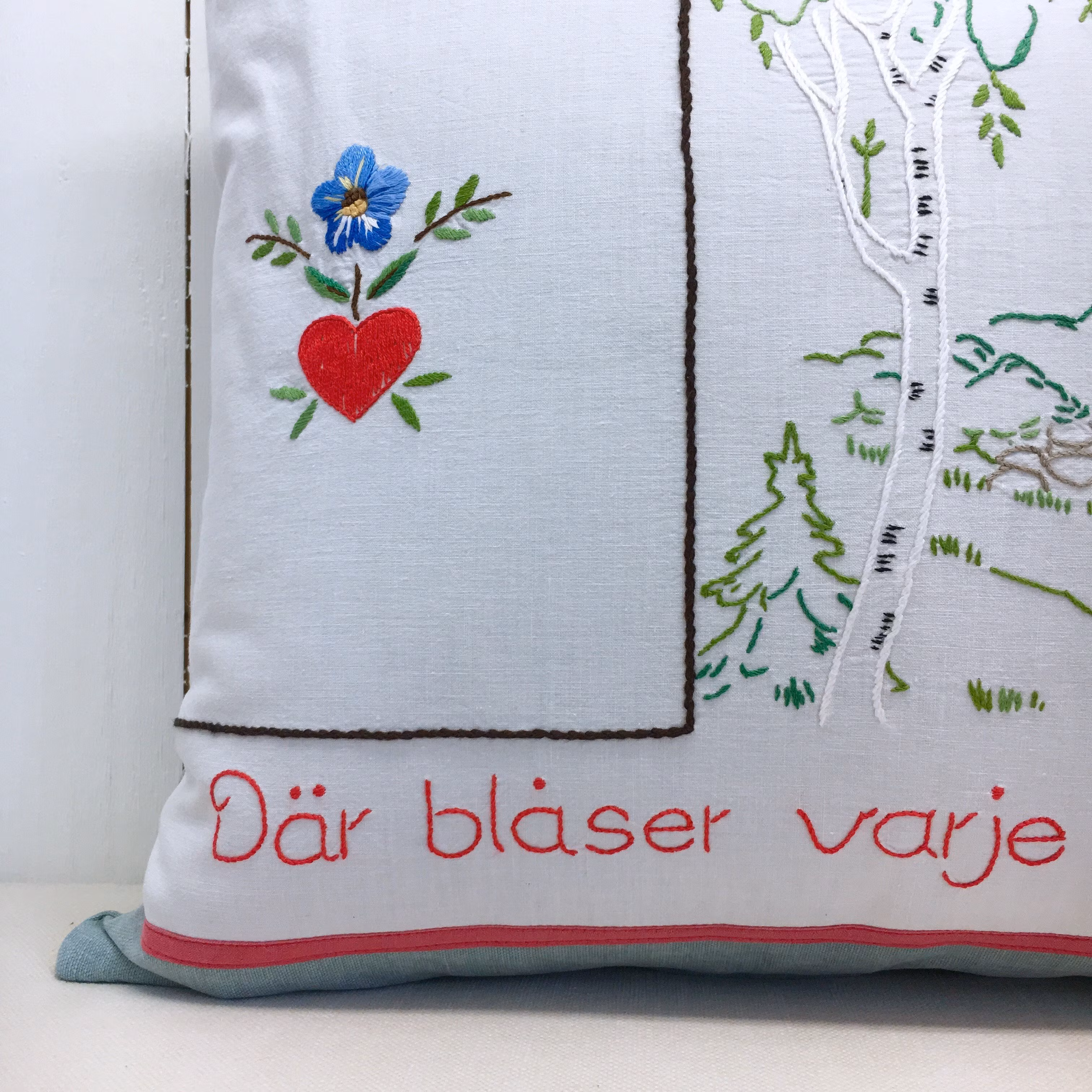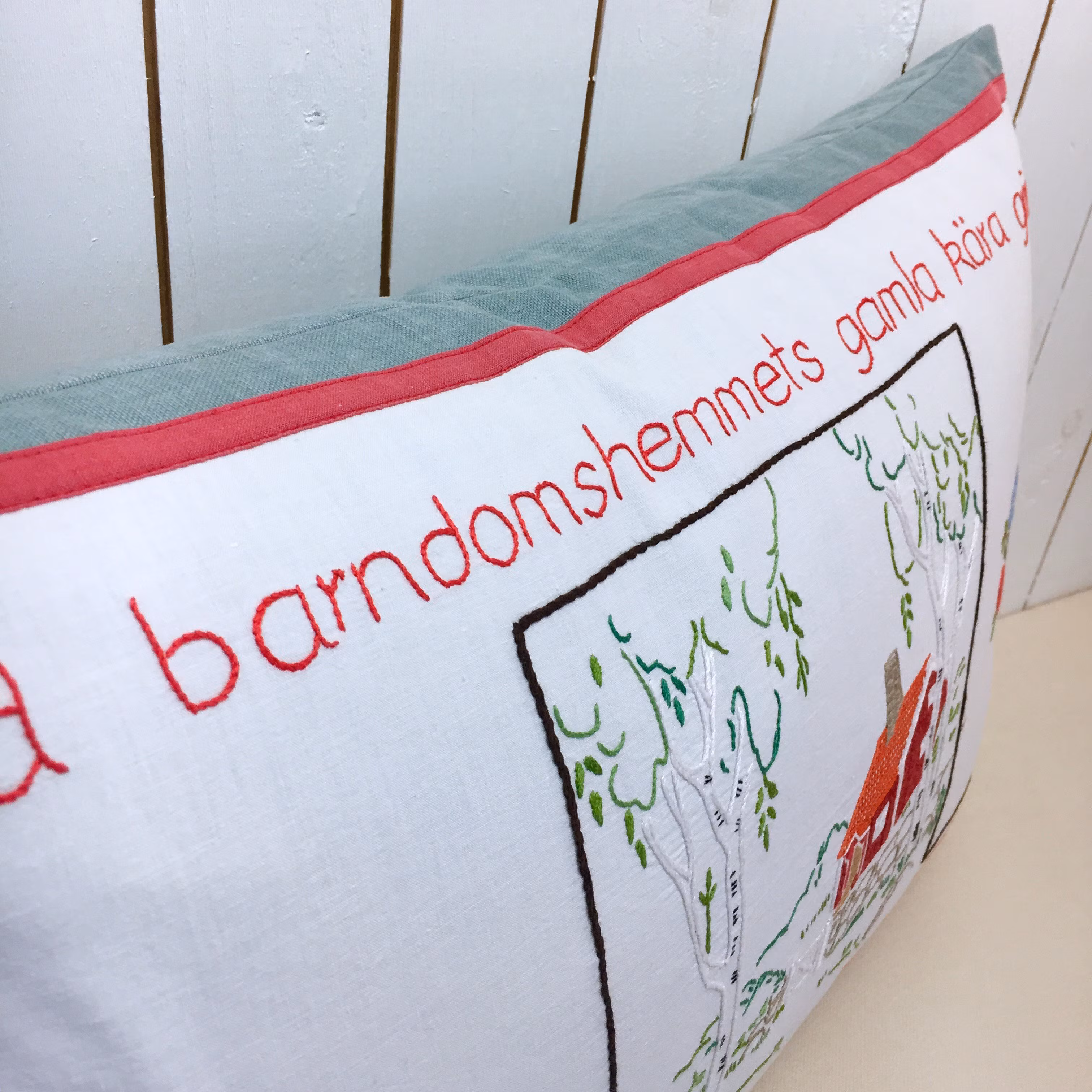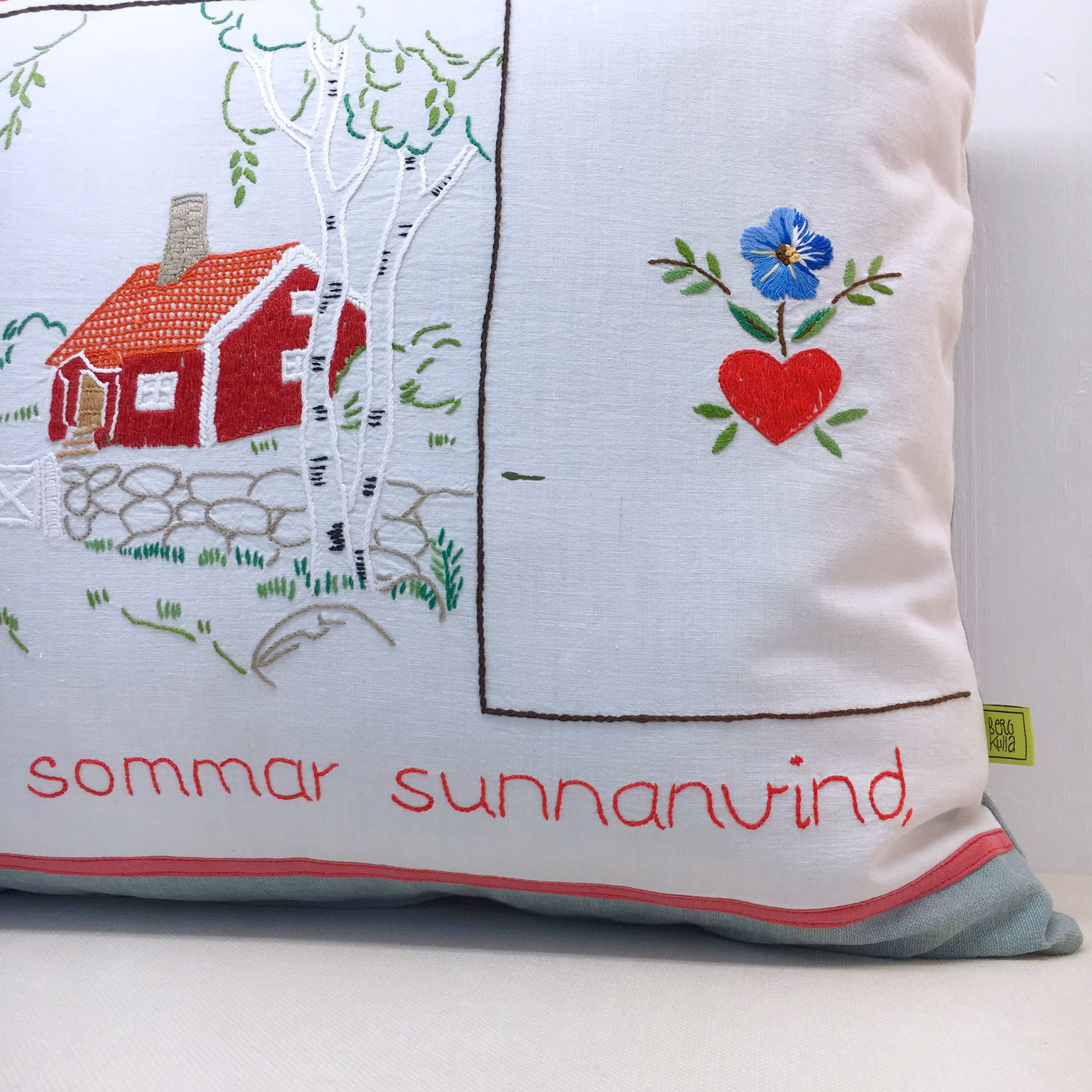 Bonadskudde med framsida dekorerad av en broderad bonad med texten "Vid barndomshemmets gamla kära grind, där blåser varje sommar sunnanvind". Kuddfodral i turkos borstat bomullstyg. Dragkedjeöppning.