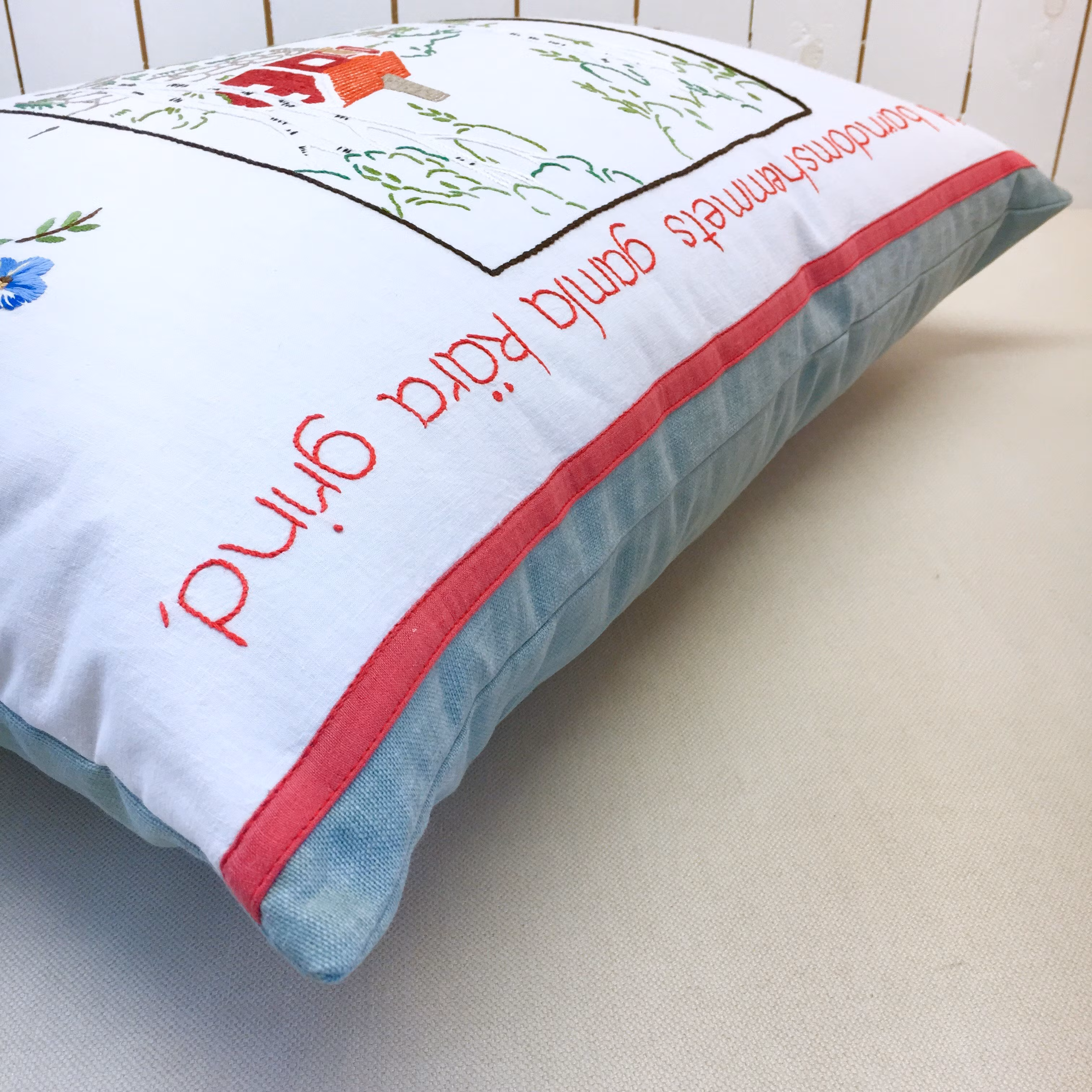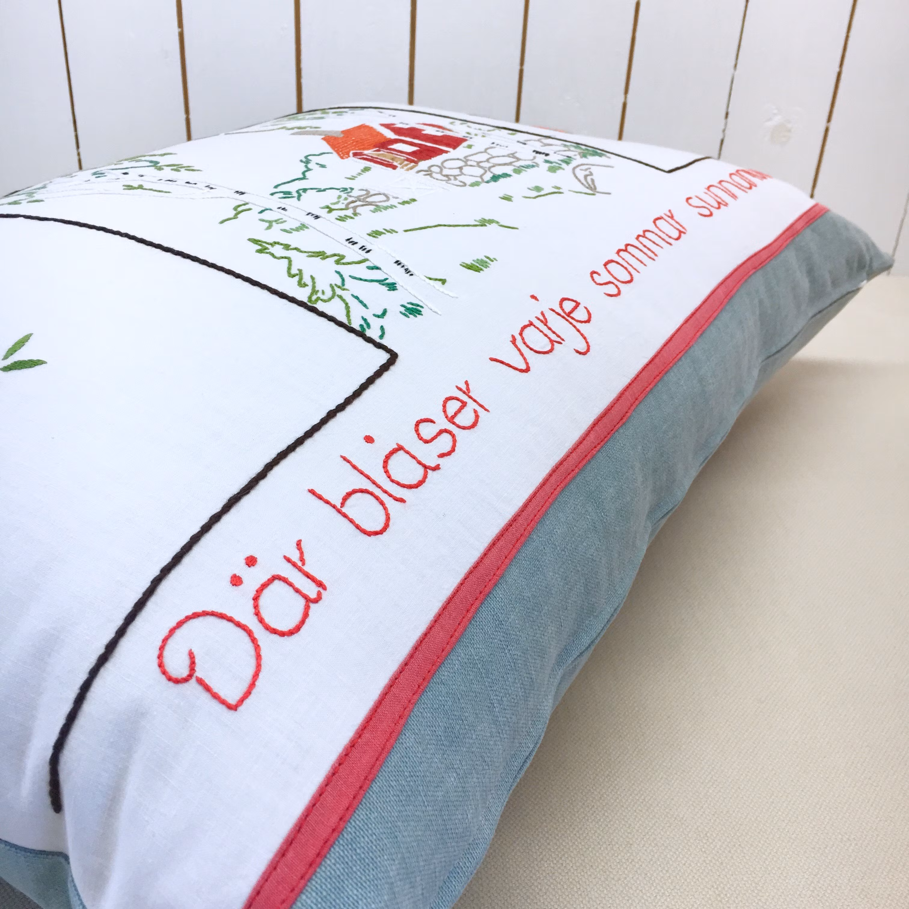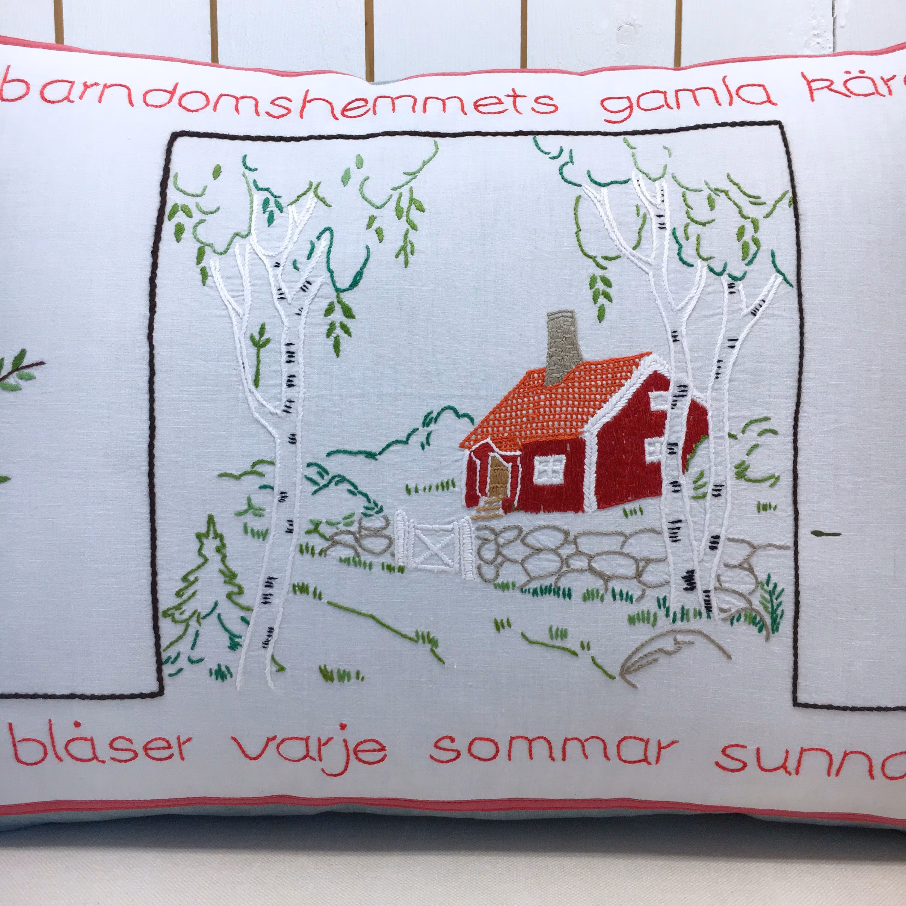 Bonadskudde med framsida dekorerad av en broderad bonad med texten "Vid barndomshemmets gamla kära grind, där blåser varje sommar sunnanvind". Kuddfodral i turkos borstat bomullstyg. Dragkedjeöppning.