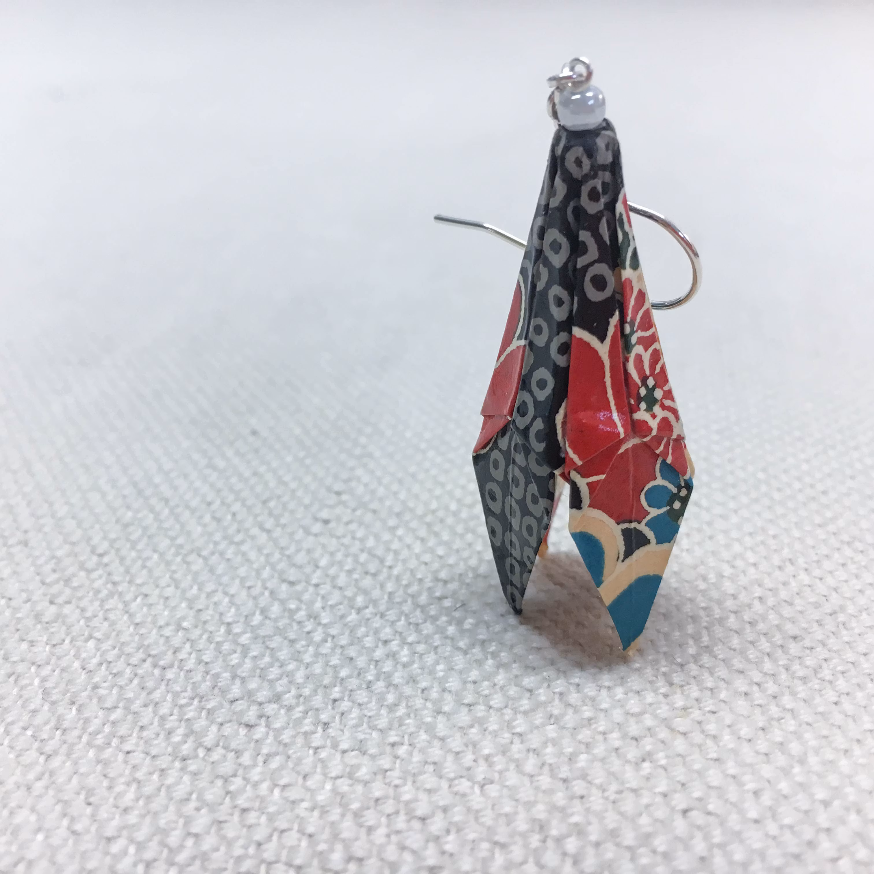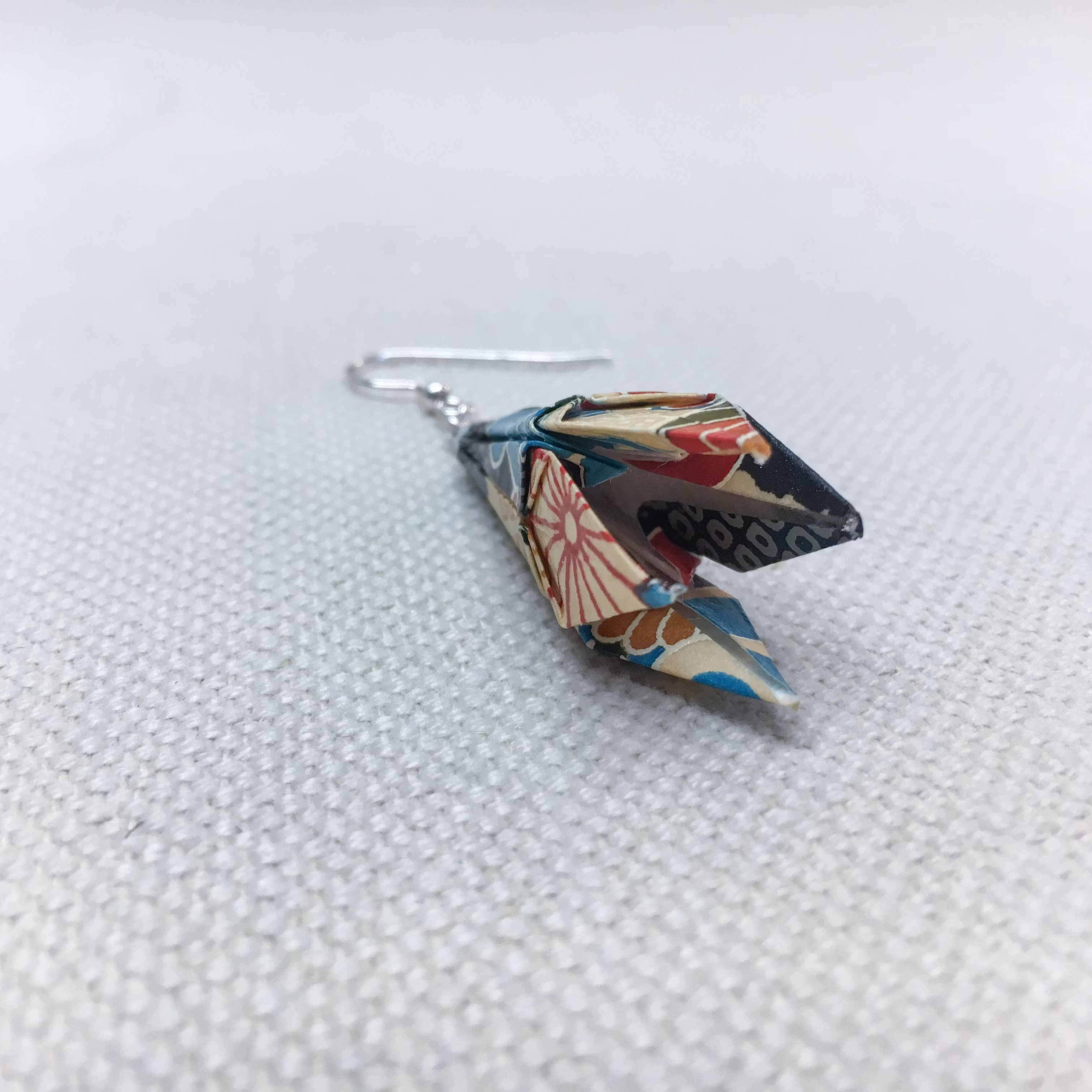 Origami-örhänge med vikt lilja av japanskt origamipapper. Liljan är ca 3,5 cm hög. Liljorna är lackade tre gånger för att få en bra hållbarhet och är monterade med silverkedja och öronkrokar i silver, nickelsäkra. Detta örhänge säljs styckvis, men köper du två stycken örhängen så blir priset 295kr för båda. Skriv i så fall in kampanjkoden PARRABATT i kassan.