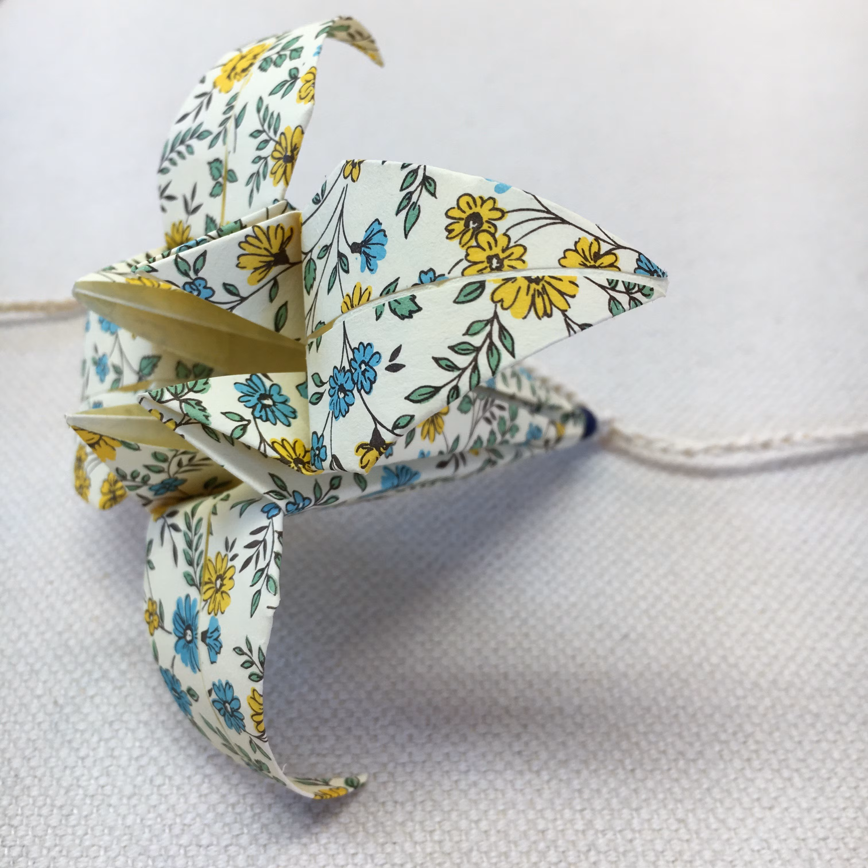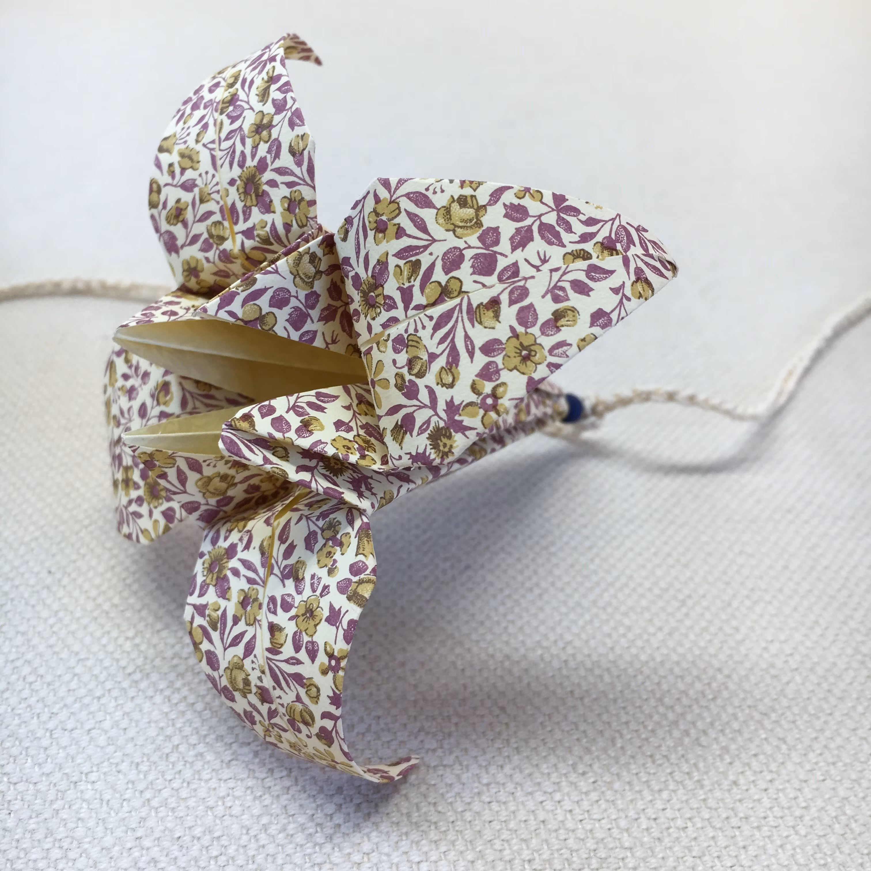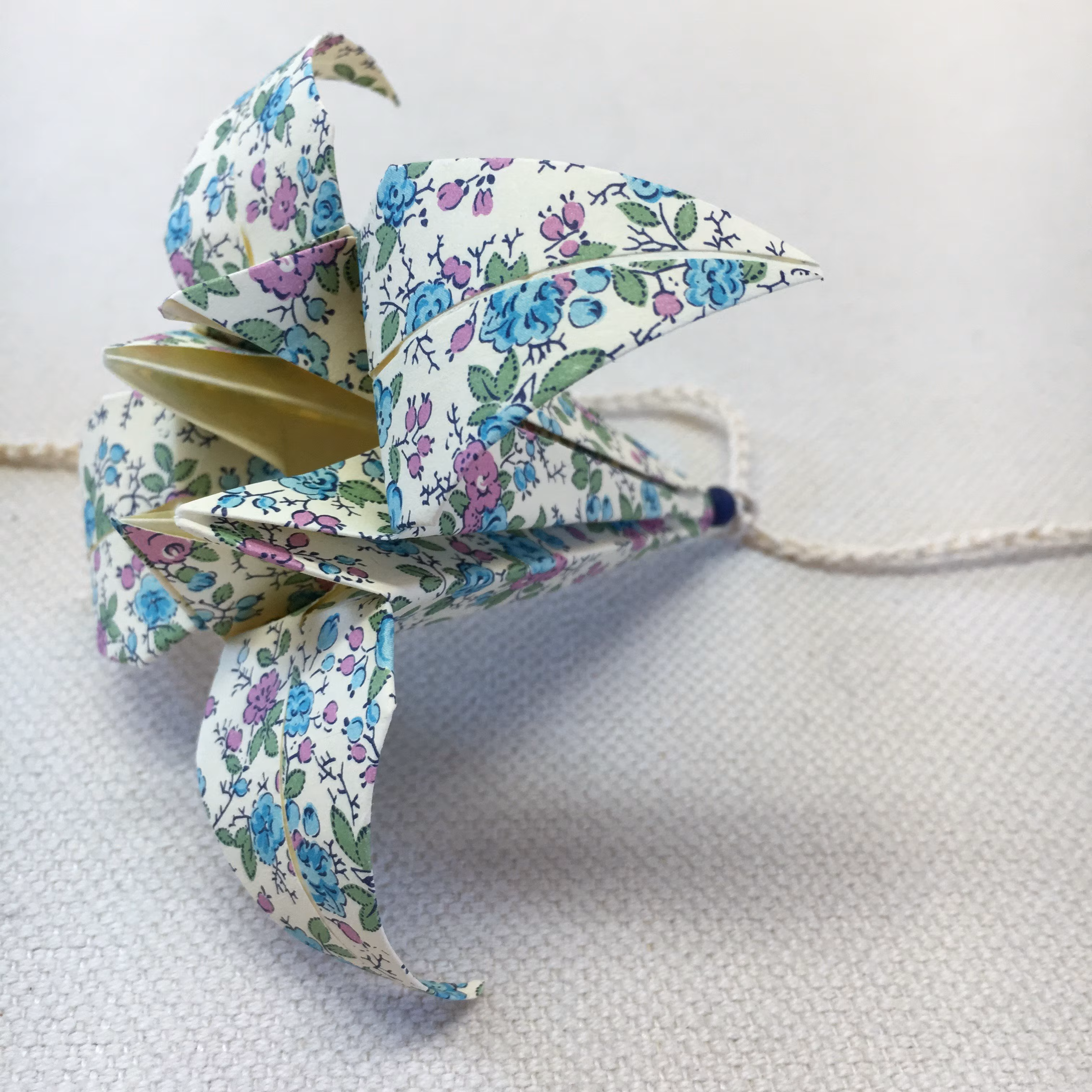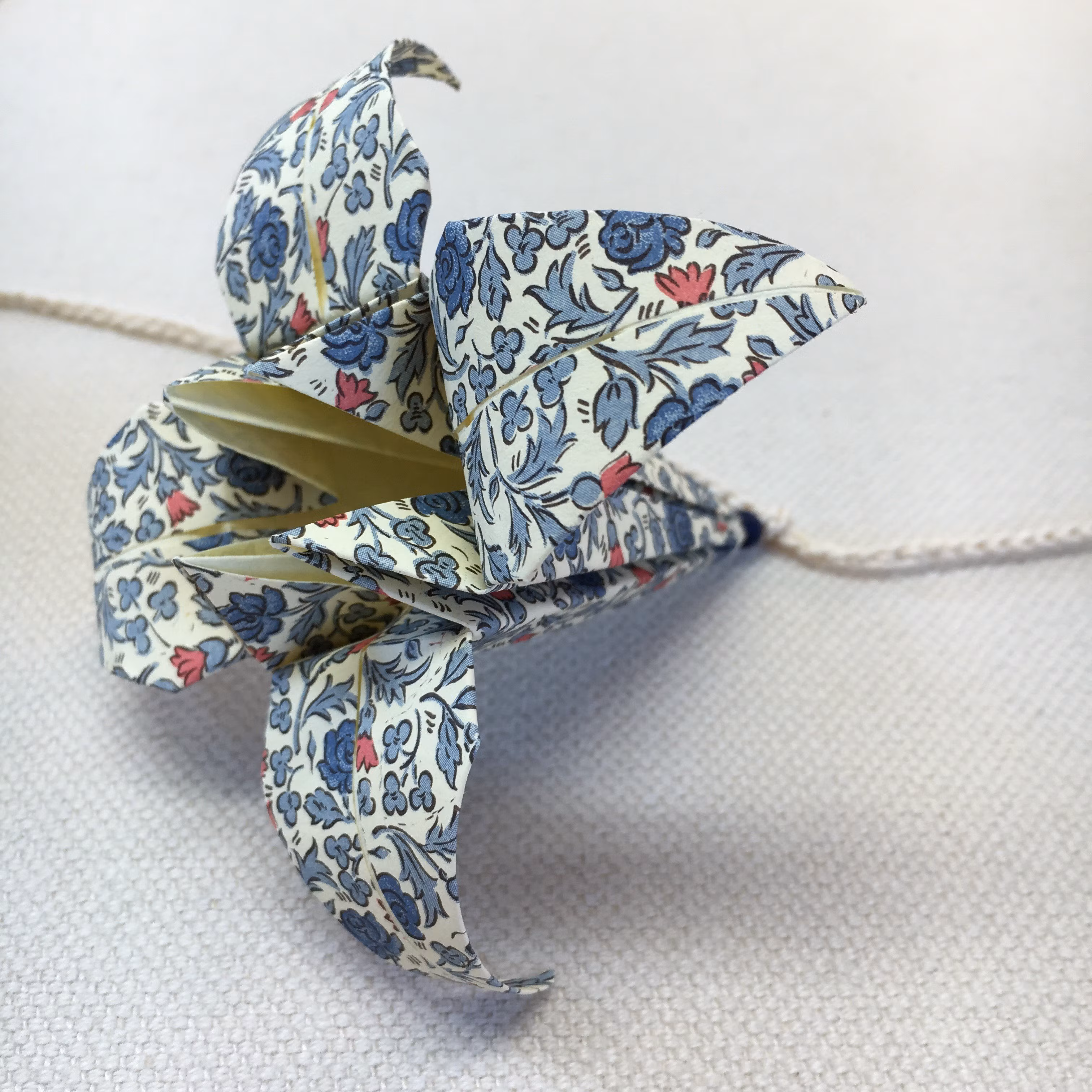 Handvikta origami-liljor på virkad vit bomullstråd med små marinblå träpärlor. Pappret är ett handtryckt italienskt papper.