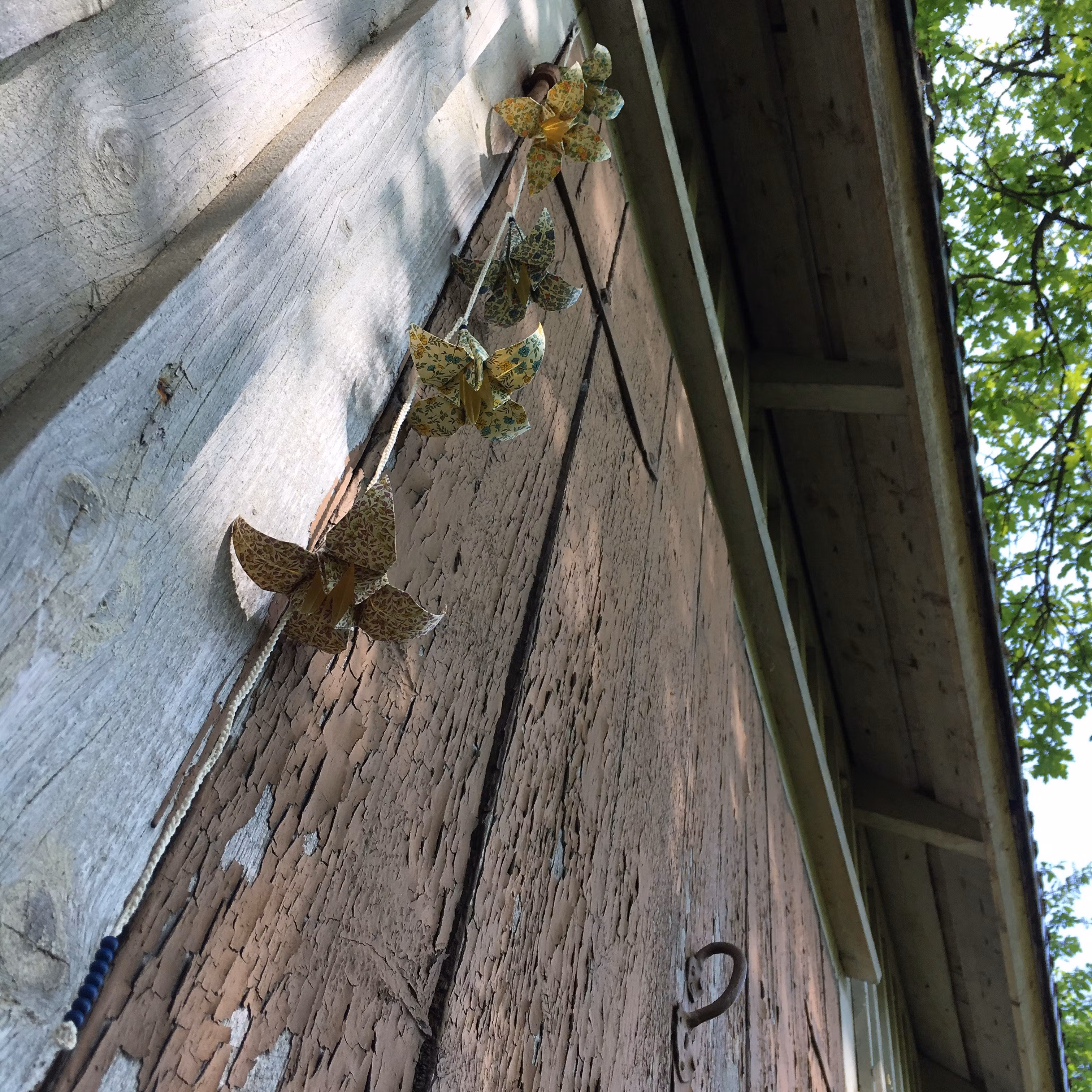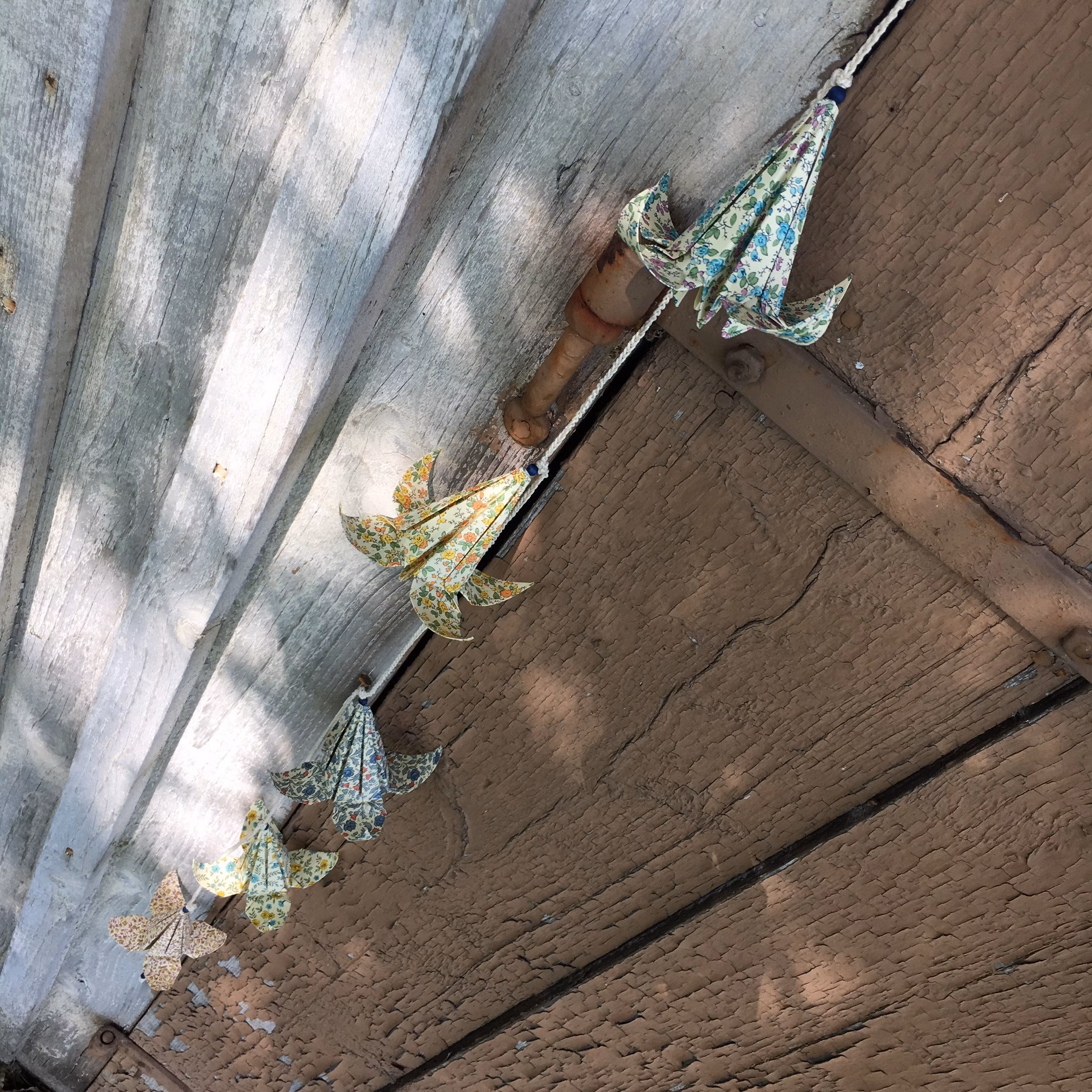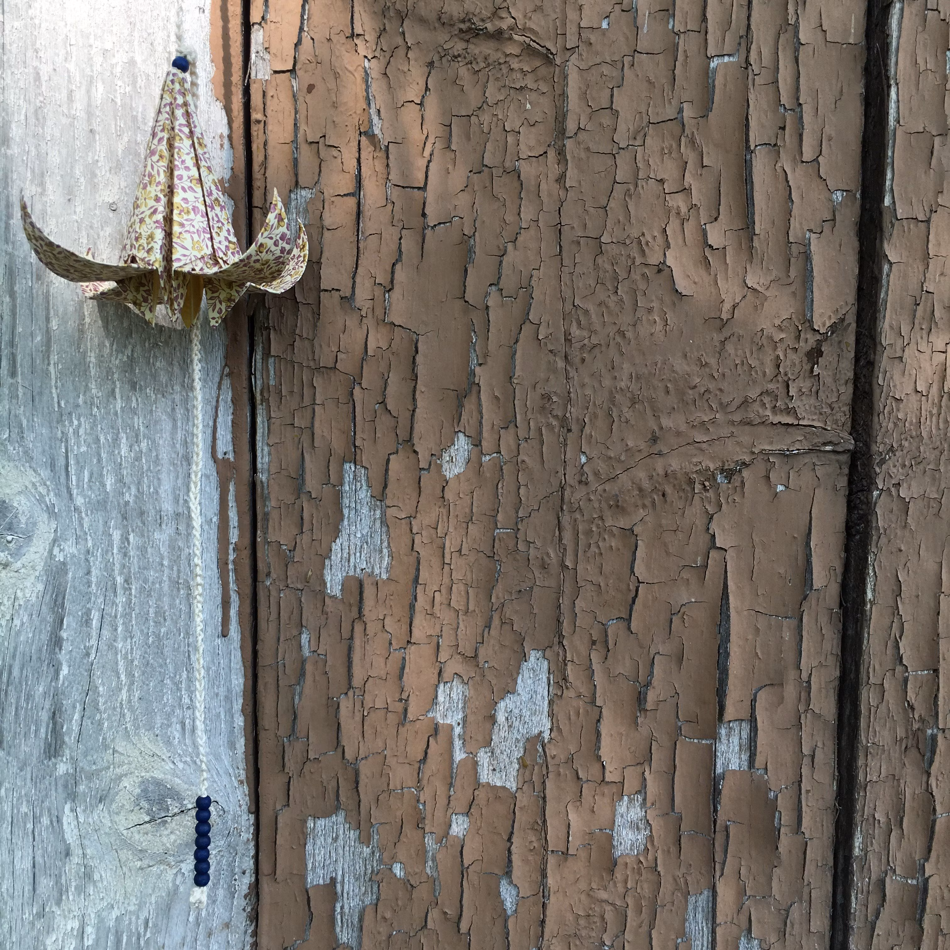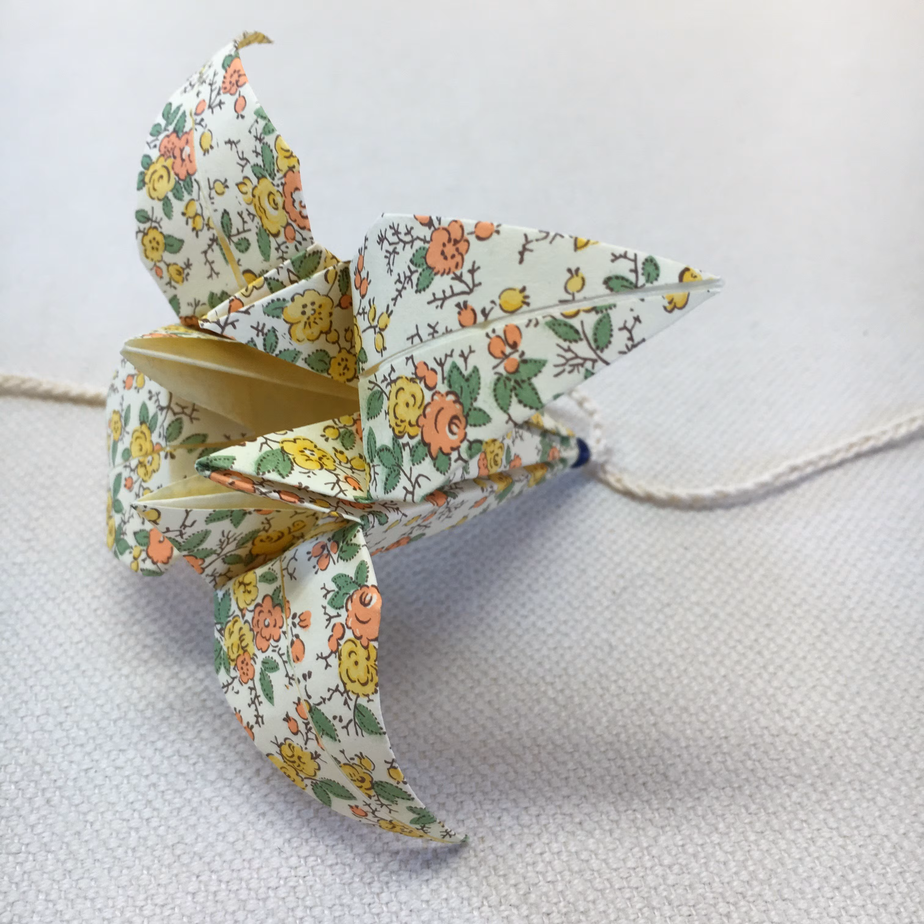 Handvikta origami-liljor på virkad vit bomullstråd med små marinblå träpärlor. Pappret är ett handtryckt italienskt papper.